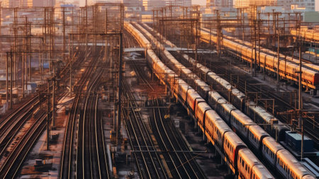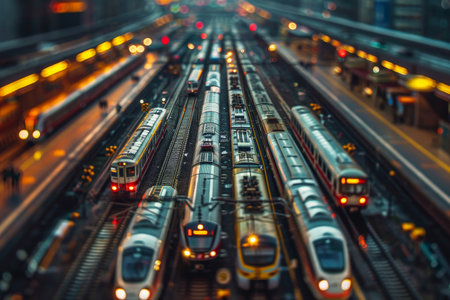 A stunning view of modern trains lined up in a vibrant railway station showcasing intricate architecture and dramatic lighting, emphasizing the heartbeat of urban transportation.