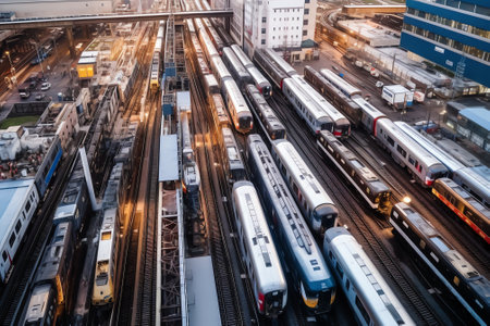 An overhead view of a busy train station with trains arriving and departing on multiple tracks, capturing the hustle and bustle of daily commuter life.