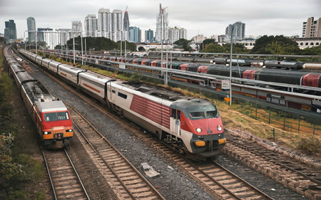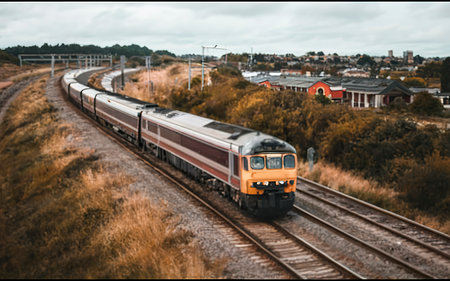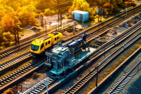 A captivating scene showcasing a vivid train track with bright yellow trains in a modern urban setting. The perspective emphasizes movement and technology.