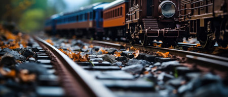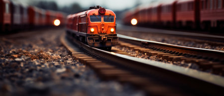 Colorful toy trains in motion on the tracks, miniature locomotives moving gracefully