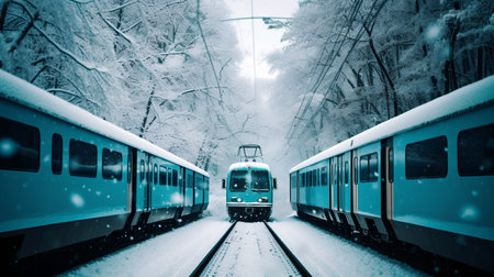 Couple of trains sitting on top of train tracks next to each other. Generative AI.