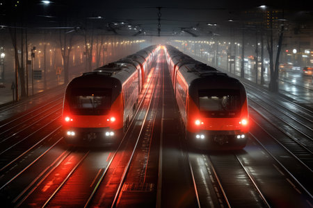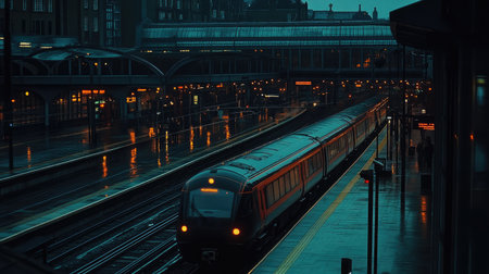An evening shot of a high-speed train illuminated by city lights as it departs from a bustling station, showcasing the vibrant energy of urban travel