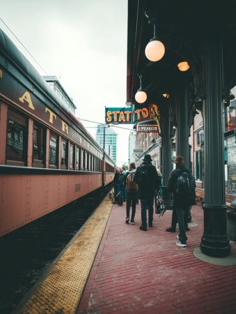 People stroll along a historic train station platform, engaging in travel activities while admiring vintage signage under a cloudy sky.