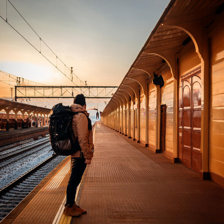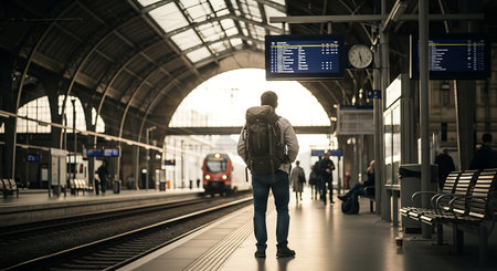 Young man with backpack on a train station platform, waiting for his journey. Travel.