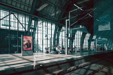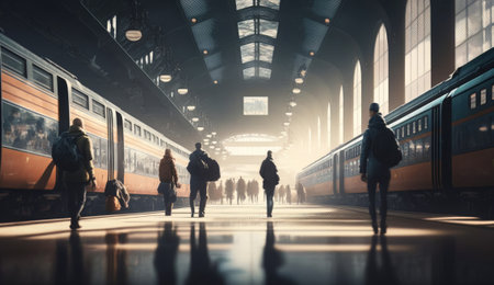 Passengers move through a spacious train station, surrounded by a translucent space background as they await their trains on a bright morning, blending into the atmosphere. Generative AI.