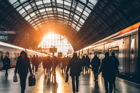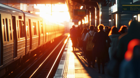 Golden Hour Commute: Busy Train Station with People Walking and Sunlight Streaming Through