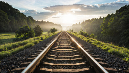 Dramatic railway perspective with golden sunlight breaking through clouds above rural countryside. Perfect for travel, journey, and destination concepts in commercial projects.