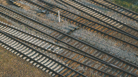 Railway track line in sunlight, beautiful train track landscape. Railroad with ballast gravel, rails and crushed stone. Industrial railway network for cargo delivery to railway station