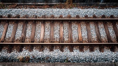 This stunning image captures train tracks at sunset, featuring pebbles and gravel, highlighting a tranquil evening atmosphere, perfect for travel and exploration themes.