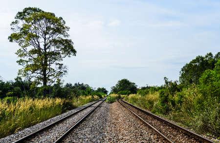 Railway tracks from one city to another in Thailand in the evening of the sunset.