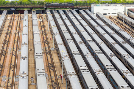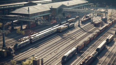 Overhead view of train yard with trains on the tracks and one on the ground. Generative AI.
