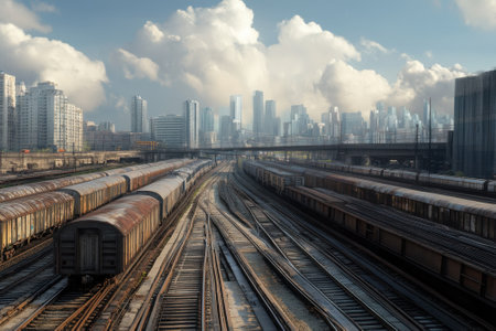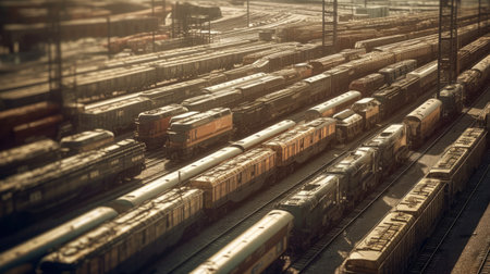 Complex Network of Train Tracks and Cargo Containers in a Rail Yard During a Sunny Day. Generative AI