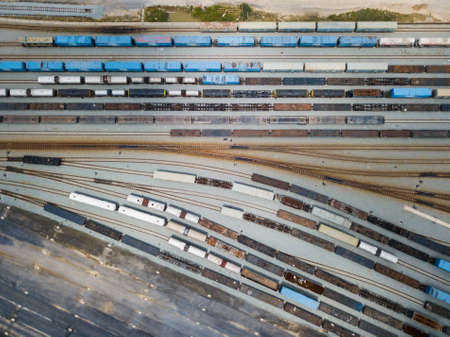 Aerial view of rail sorting freight station with various wagons, with many rail tracks railroad. Heavy industry landscape