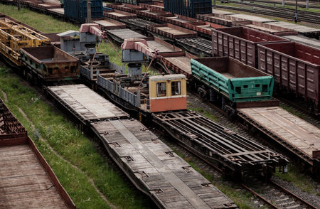 Large metal wagons, railroad runs with small green grass located on the loading production hub. A bright and colorful railway freight station located in the Rechport area of the city of Kamenskoye.