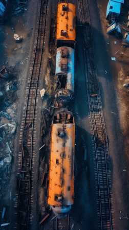 aerial view of vast train graveyard at sunset, created with generative ai