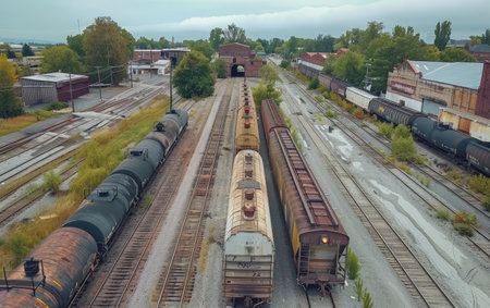 Aerial drone view of a freight train at a railway station, showcasing industrial transport infrastructure with steel tracks and cargo carriages. Ideal for logistics themes.