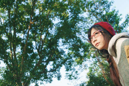 Photo of joyful beautiful asian woman smiling and looking aside while walking outdoors