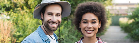 cheerful multiethnic farmers smiling at camera in blurred garden, banner