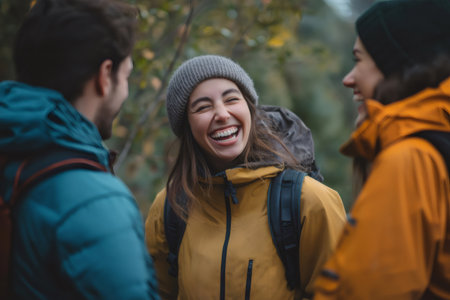 Group of young hikers laughing and having fun while trekking in a forest, enjoying their outdoor adventure