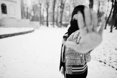 African muslim woman wear in black hijab scarf pose in winter day at Europe and show stop sign by hand.