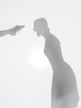 woman body silhouette standing and screaming, beeing thretened with a gun, behind a diffuse surface