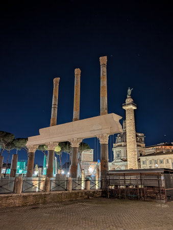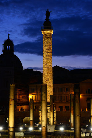 Evening view of the ancient Trajan's Column in the Imperial Forum in Rome