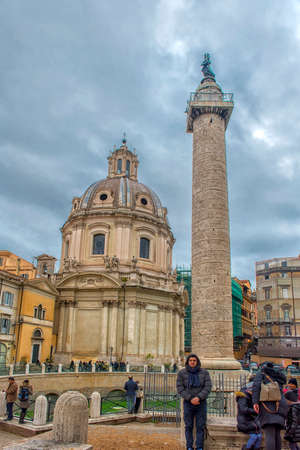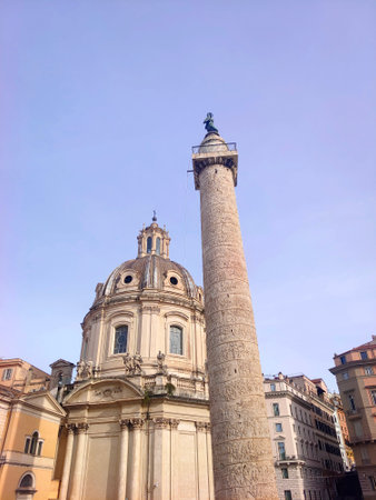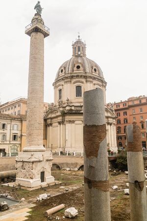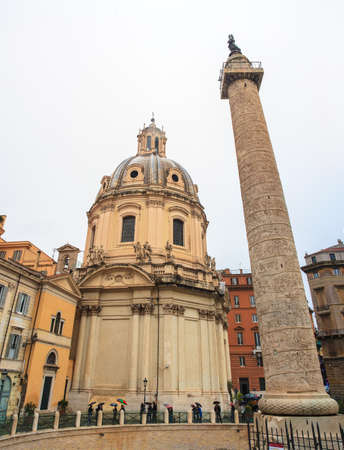 Rome, Italy. October 31, 2018: The Church of the Most Holy Name of Mary at the Trajan Forum and the Trajan's Column. Roman triumphal column in Rome, Italy, that commemorates Roman emperor Trajan.