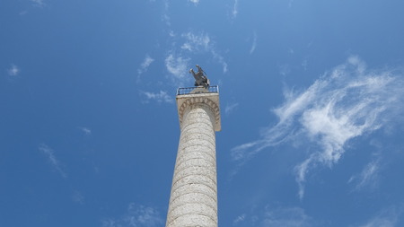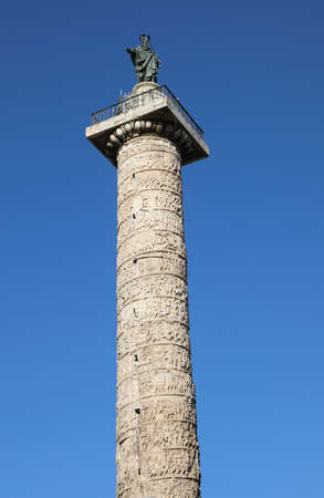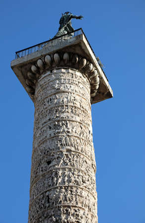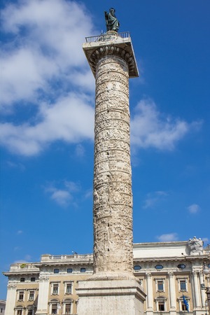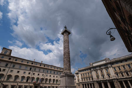 Marble Column of Marcus Aurelius in Piazza Colonna square in Rome, Italy. It is a Doric column about 100 feet high built in 2nd century AD and featuring a spiral relief.