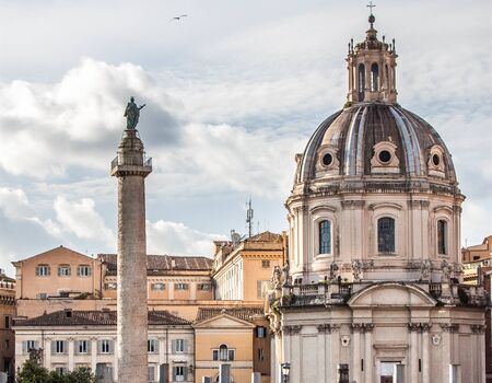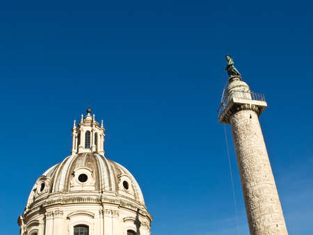 The dome of the Saint Mary of Loreto church and Trajan's column on the Trajan's forum in the historic center of Rome, Italy