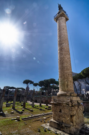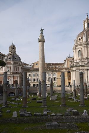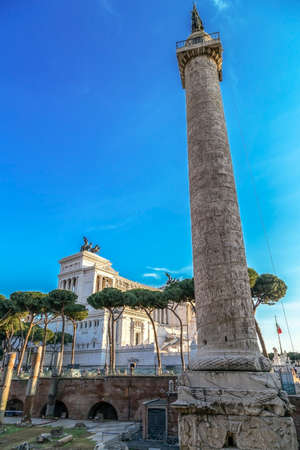 Old Monument and Column of Trajan in the Imperial Forums in Rome Italy