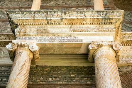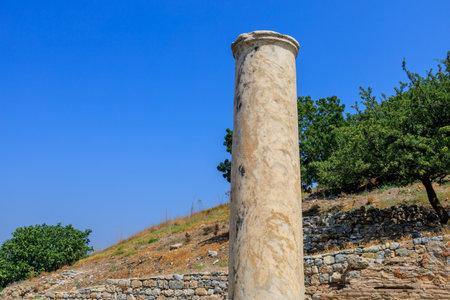 The ruins and ruins of the ancient city of Ephesus against the blue sky on a sunny day. Turkey