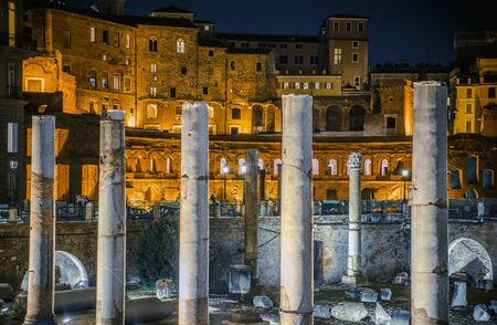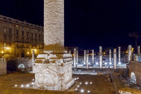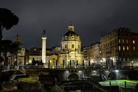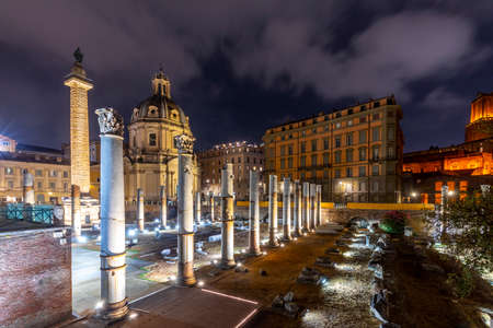 Trajan's Column in the Forum of Trajan in Rome, Italy. This is the first ever raised coclide column, honorary monument of the ancient Romans. Night photography, artificial lighting.