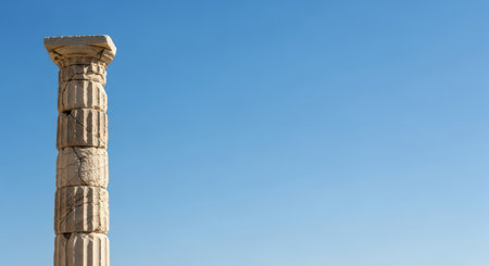 Majestic ancient columns reach towards a bright blue sky, capturing the essence of history and culture. A stunning view perfect for travel and exploration themes.