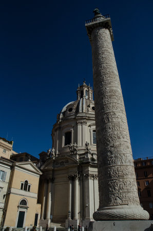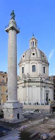 Rome, Italy. October 31, 2018: The Church of the Most Holy Name of Mary at the Trajan Forum and the Trajan's Column. Roman triumphal column in Rome, Italy, that commemorates Roman emperor Trajan.
