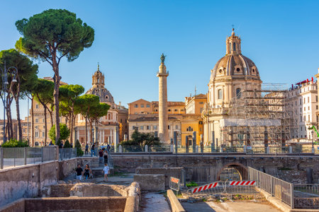 Rome, Italy - 05 October 2022: Trajan's Column and Church of the Most Holy Name of Mary at Trajan Forum