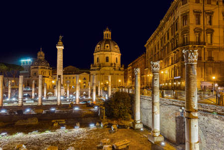 Trajan's Column in the Forum of Trajan in Rome, Italy. This is the first ever raised coclide column, honorary monument of the ancient Romans. Night photography, artificial lighting.