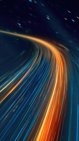 An abstract image showcases glowing light trails in shades of orange and blue against a dark backdrop. The composition features curving lines, suggesting movement and speed. This graphic element evokes a sense of technology and could be suitable for various commercial design applications.