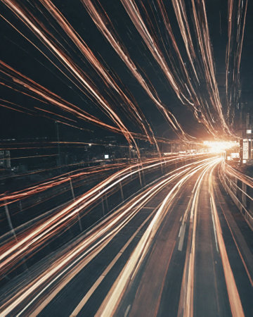 A dramatic nighttime view of a long exposure shot of an expressway, with bright lights creating trails from moving cars, emphasizing the energy and activity of the city.
