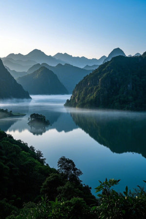 Experience the calm beauty of layered mountains enveloped in mist during sunrise. This enchanting landscape captures nature's tranquility and captivating scenery.