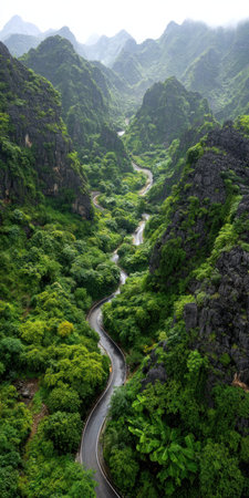 Aerial view of a winding road through a lush, verdant valley, flanked by towering, weathered peaks