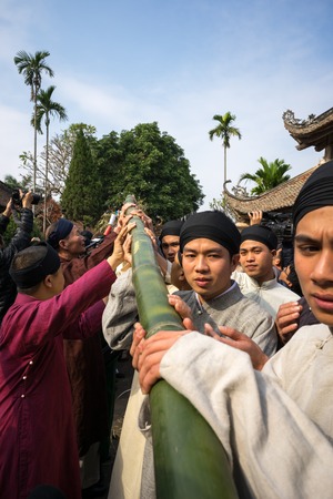 Hanoi, Vietnam - Jun 22, 2017: Raising Neu tree rituals in communal house at So village, Quoc Oai district. The bamboo pole placed in front of house on the last day of the lunar year to expel evils
