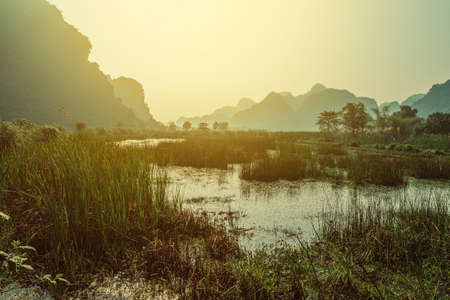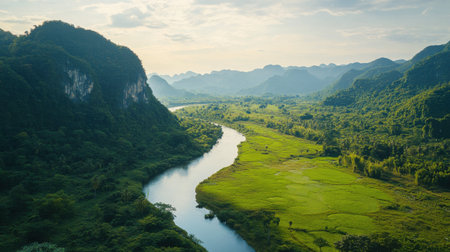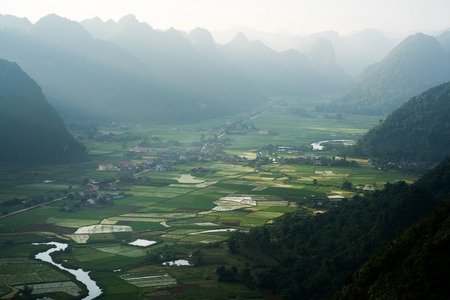 Aerial landscape in Phong Nam valley, Cao bang province, Vietnam with river, nature, rice fields, beautiful destination in Northern Vietnam - ai