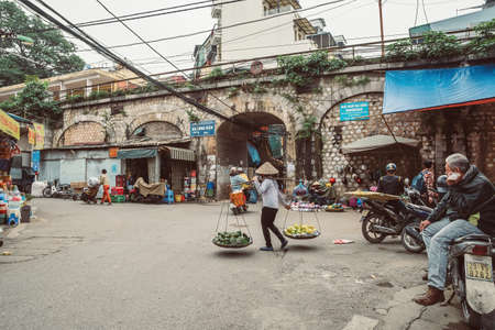 HANOI, VIETNAM - DECEMBER 14, 2018 : Street scene of the Old Quarter of Hanoi. Local daily life of the morning street market, street vendors selling various types of fruits and vegetables