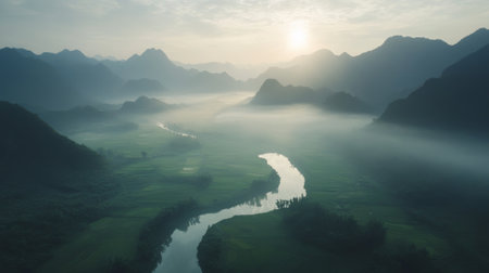 Experience the beauty of a tranquil mountain valley at sunrise, with lush hills and rolling fog creating a peaceful natural landscape that inspires adventure.