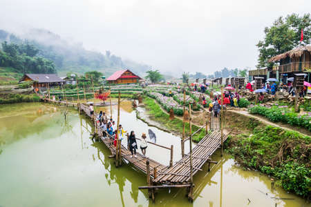 Lao Cai, Vietnam - October 12, 2018: View of traveler walked around wooden pavement, house, paddy flied and green mountain at Cat Cat village at Sa Pa, Lao Cai Province, Vietnam