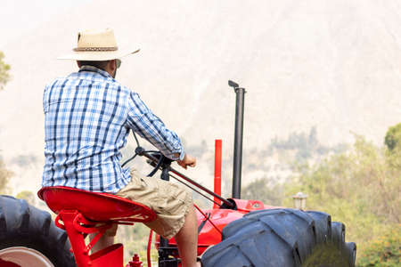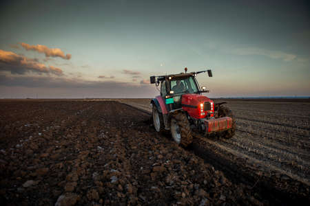 Agriculture stock picture. A small tractor on a field during the sunset time. Agriculture in Iceland, Scandinavia. Background photograph of a tractor.