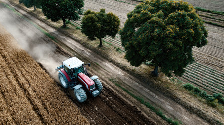 This aerial image showcases a vibrant agricultural field where a tractor is hard at work, cultivating the soil amid lush trees and a serene countryside.