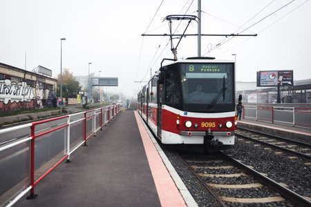 Prague, Czech Republic- October 18, 2017: Tram number 8 in Prague in a foggy morning, Czech Republic
