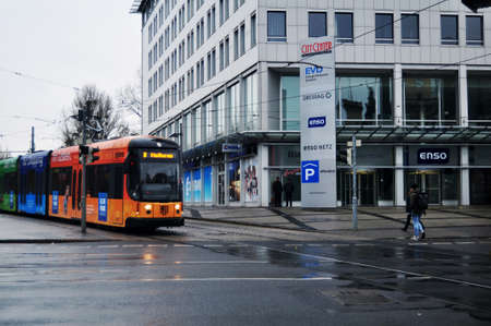 Tram railway running on street for send and receive passengers with german people walking crossing road while raining storm at Dresden capital city on November 16, 2016 in Saxony state, Germany