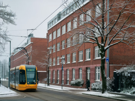 Yellow Tram on Snow-Covered Street in Urban Winter Scene